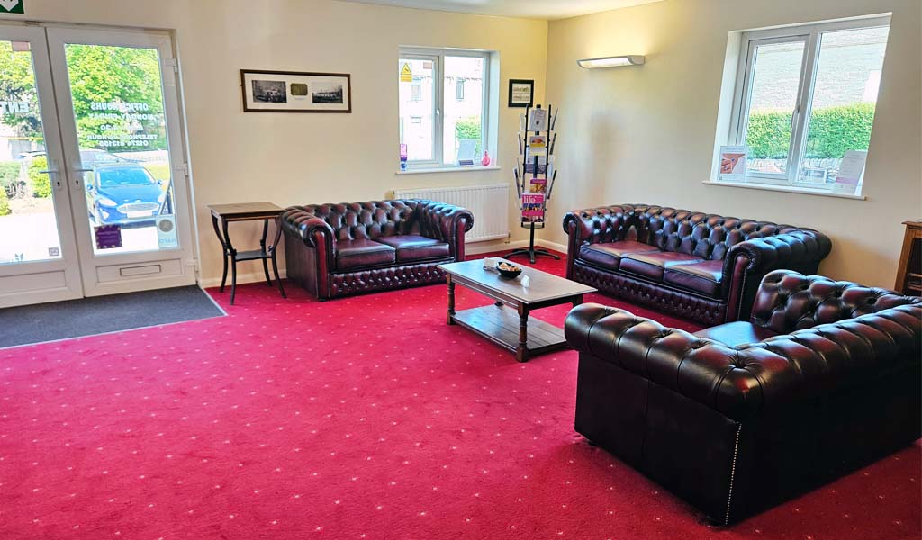 • The inside of Edwin Pounds & Sons Funeral Directors Bradford branch arranging room. There is a red carpet with dark brown sofas.